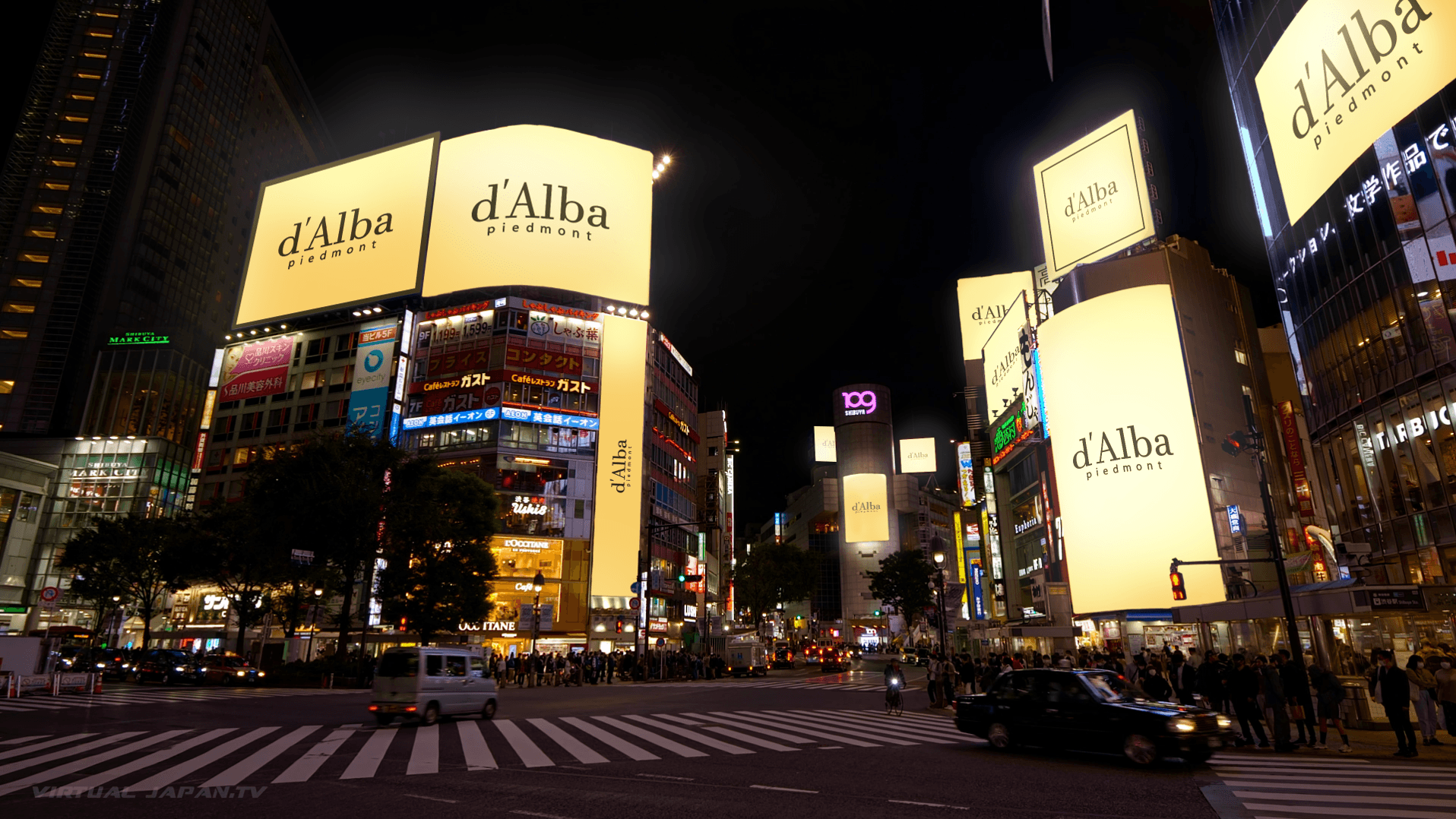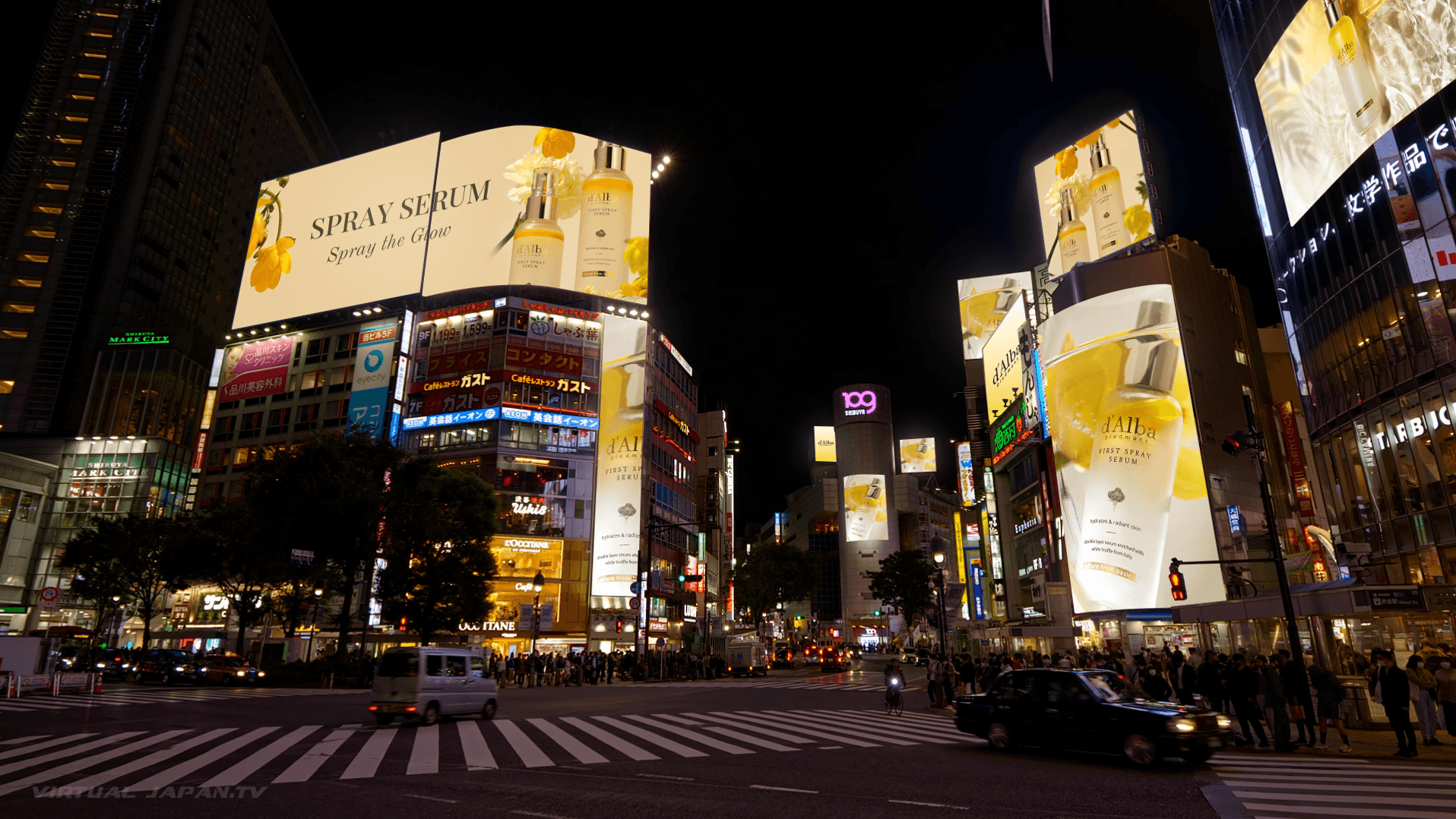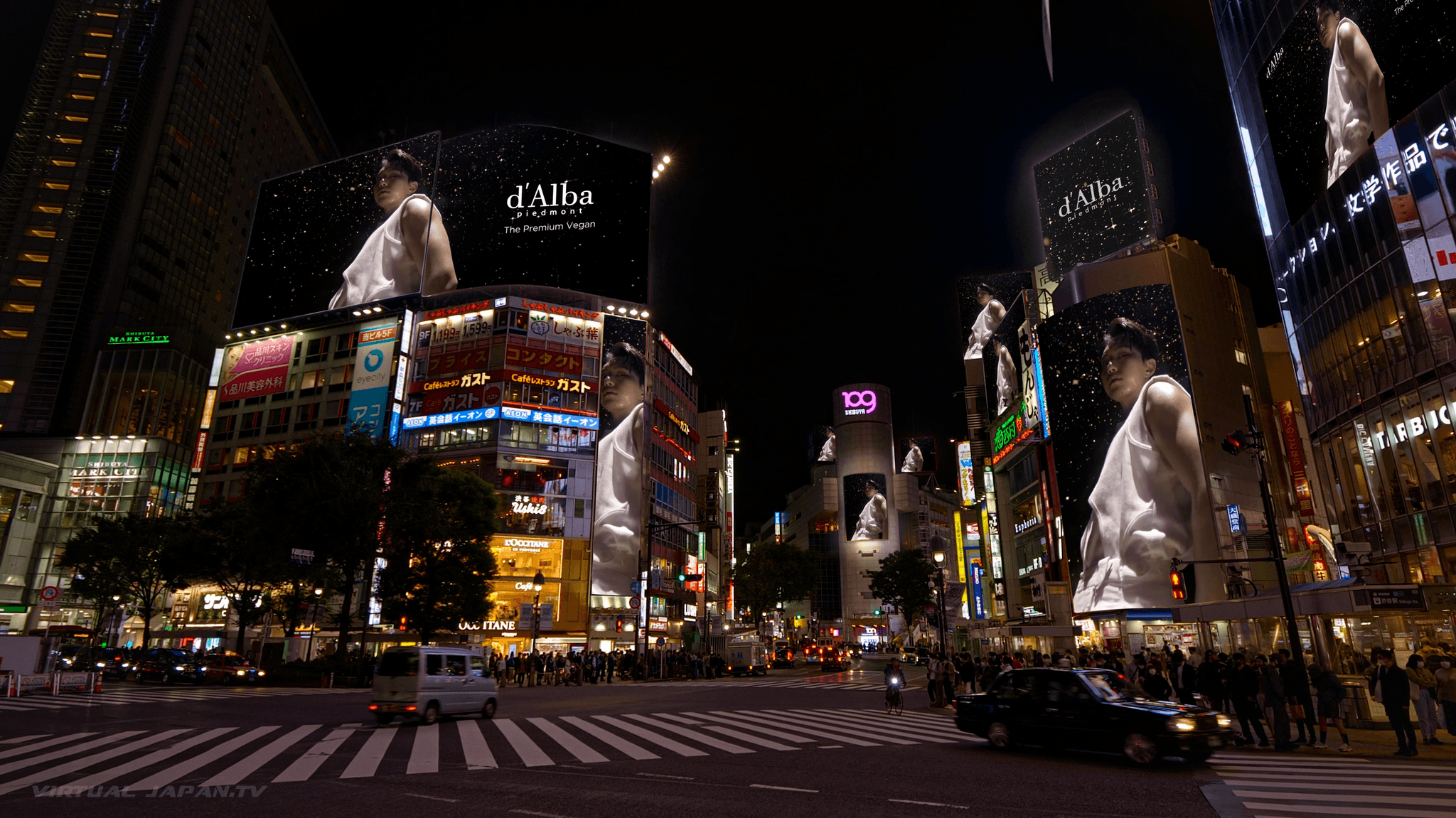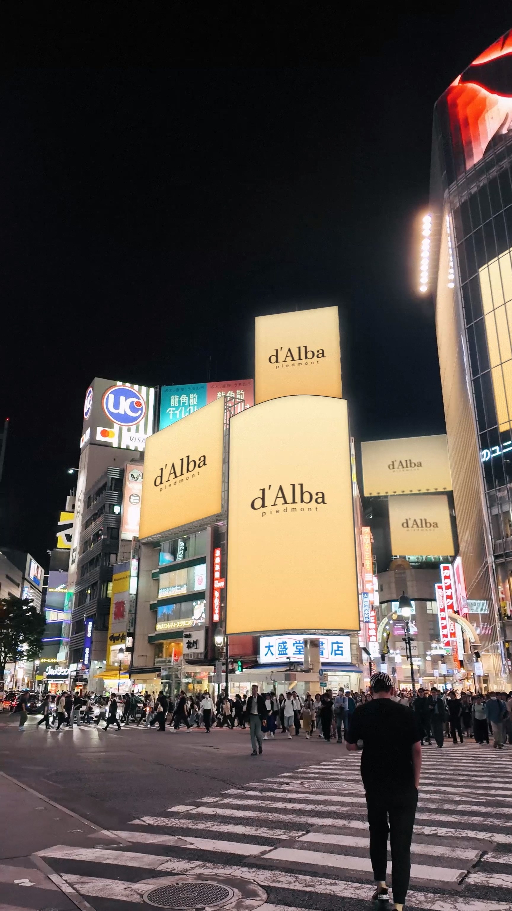 Based on live footage captured on the streets of Shibuya, Tokyo, the campaign was built around d'Alba's logo and product imagery gradually spreading across billboards and urban screens throughout the city. From on-site filming and scene composition to graphic compositing, we handled the entire production, creating content where real space and digital storytelling seamlessly blend together.