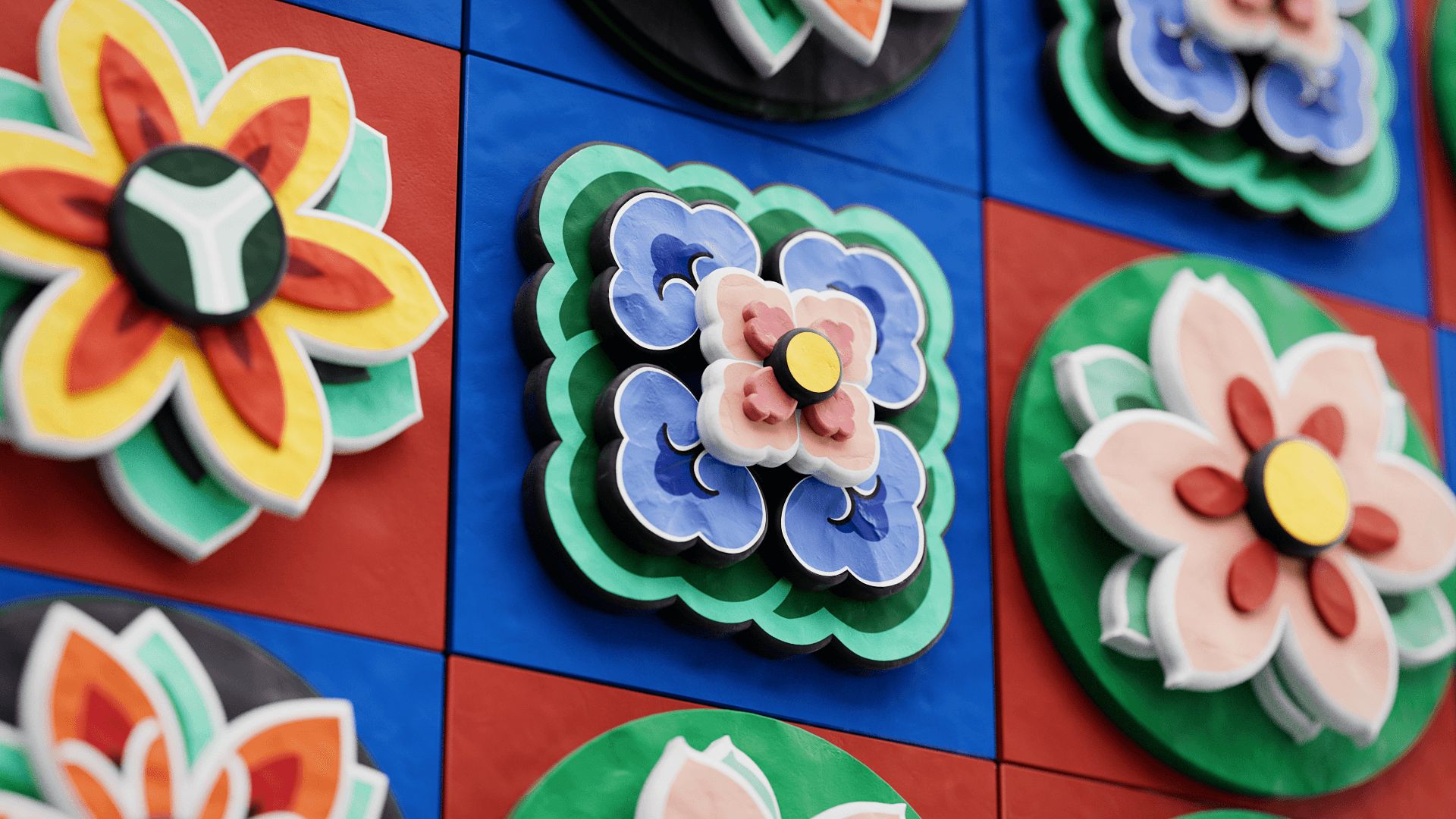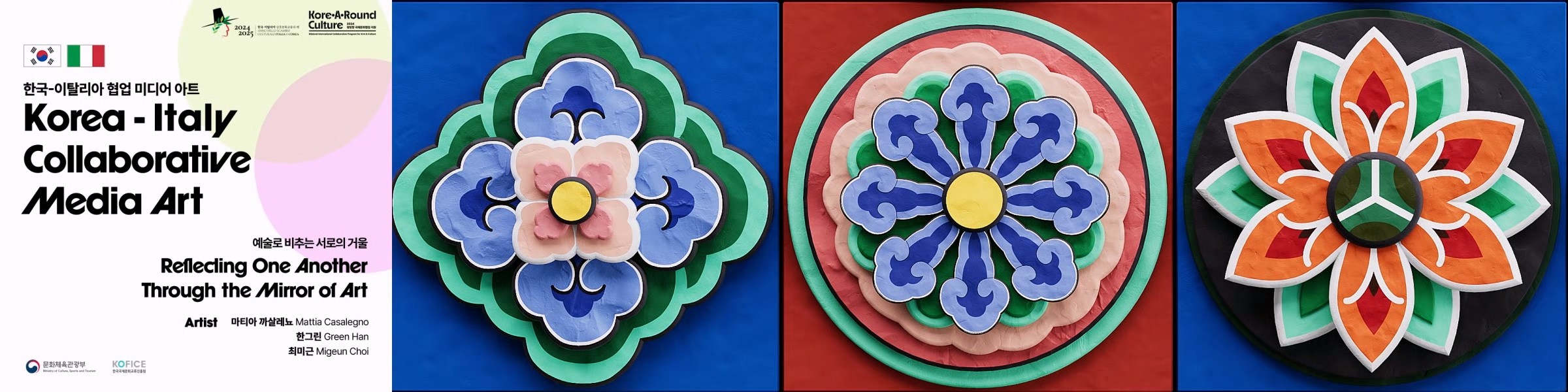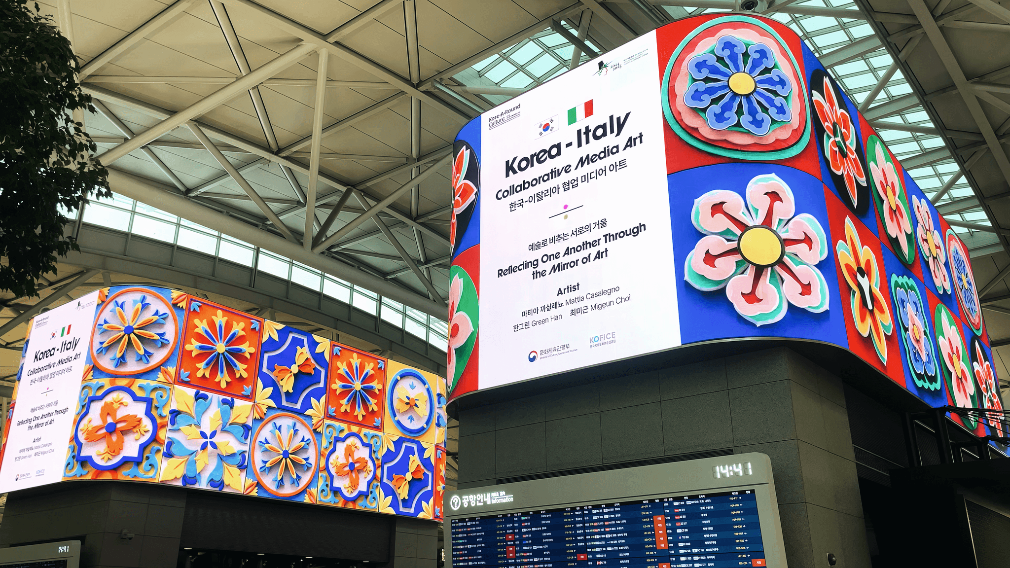 한국의 단청 문양과 이탈리아 시칠리아 패턴의 강렬한 색채를 모티프로, 두 문화의 상징을 역동적인 3D 그래픽으로 재구성했습니다. 대칭 구조 속에서 교차하고 확장되는 패턴들은 하나의 시각적 흐름을 만들어내며, 시계 바늘의 움직임을 연상시키는 구성으로 두 나라의 오랜 우정을 은유적으로 표현합니다.
