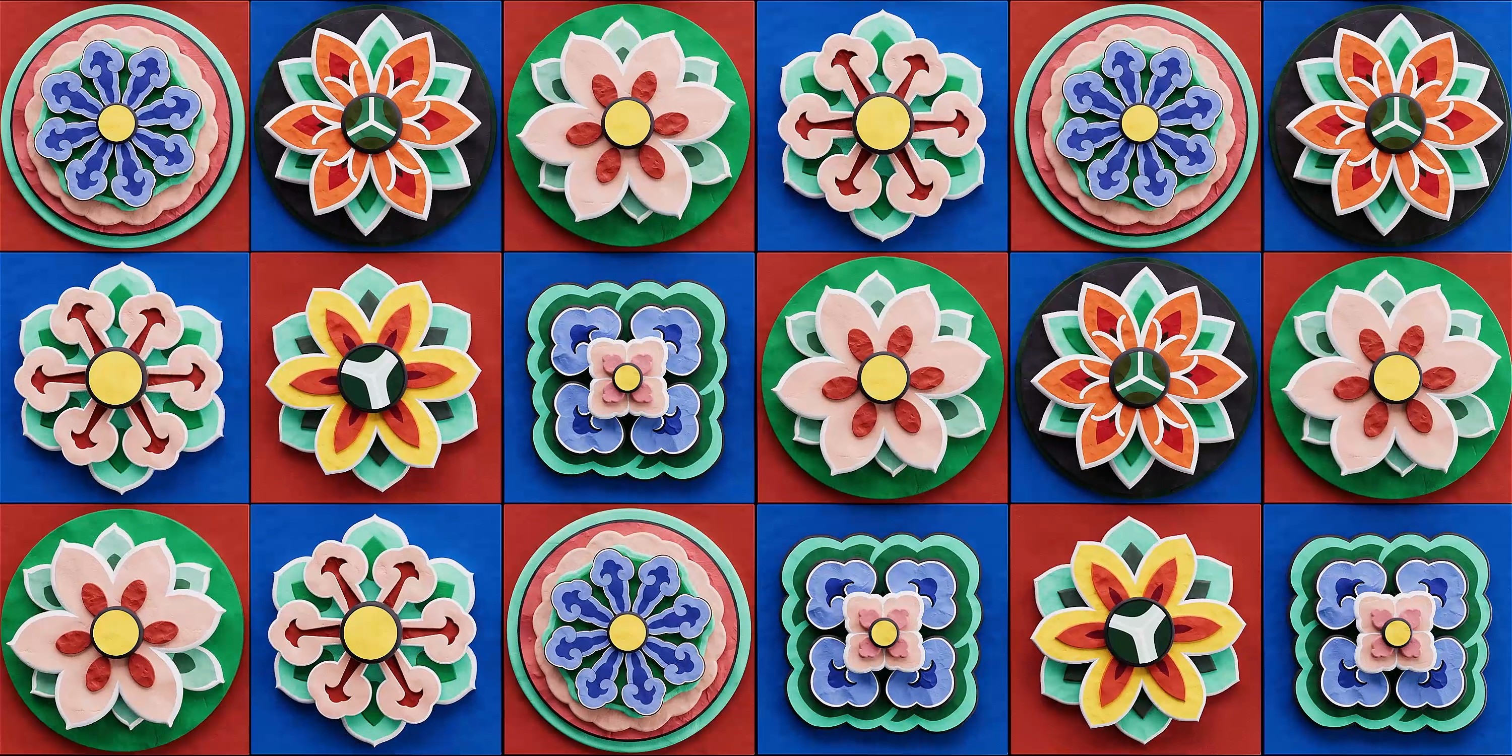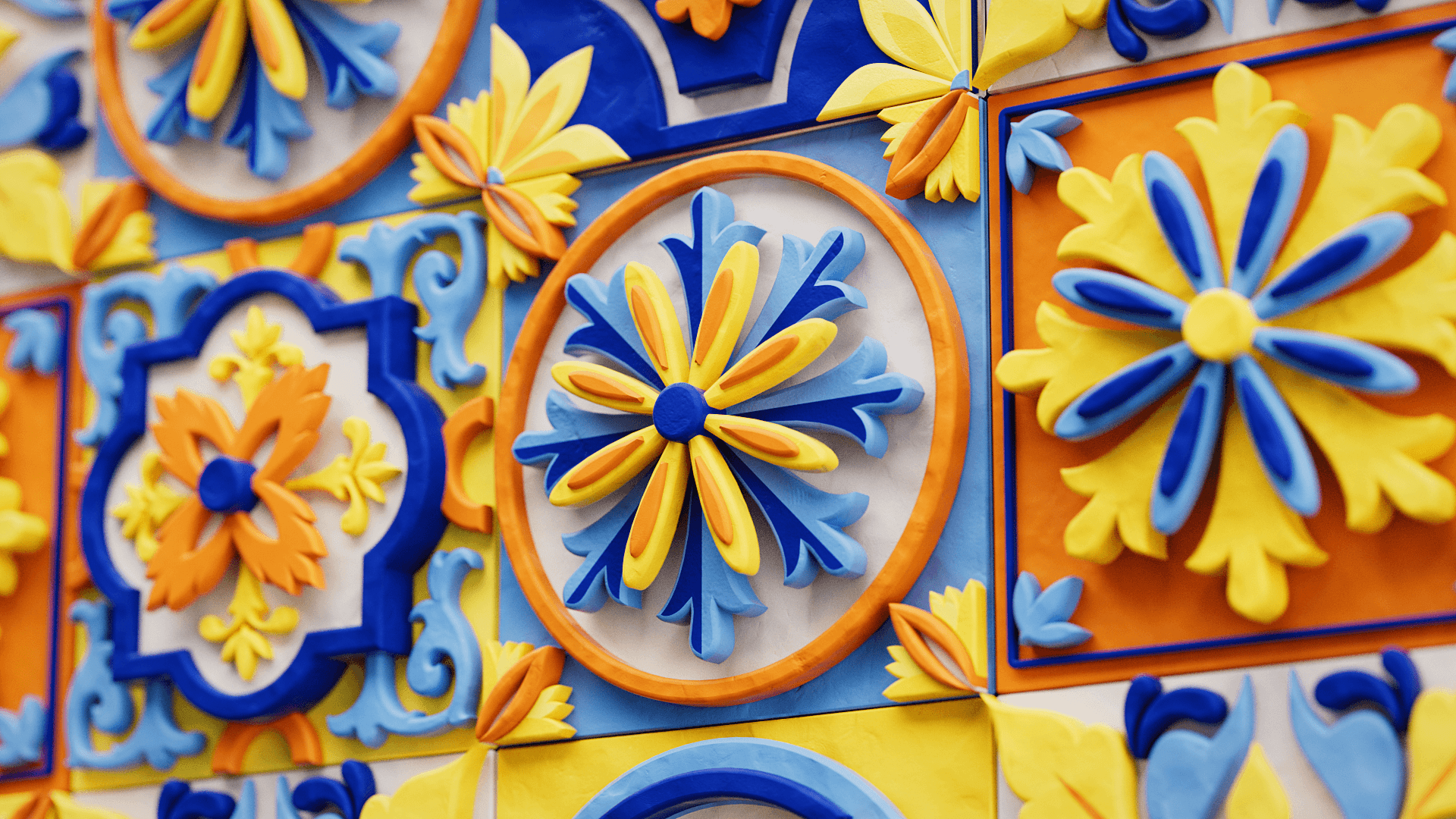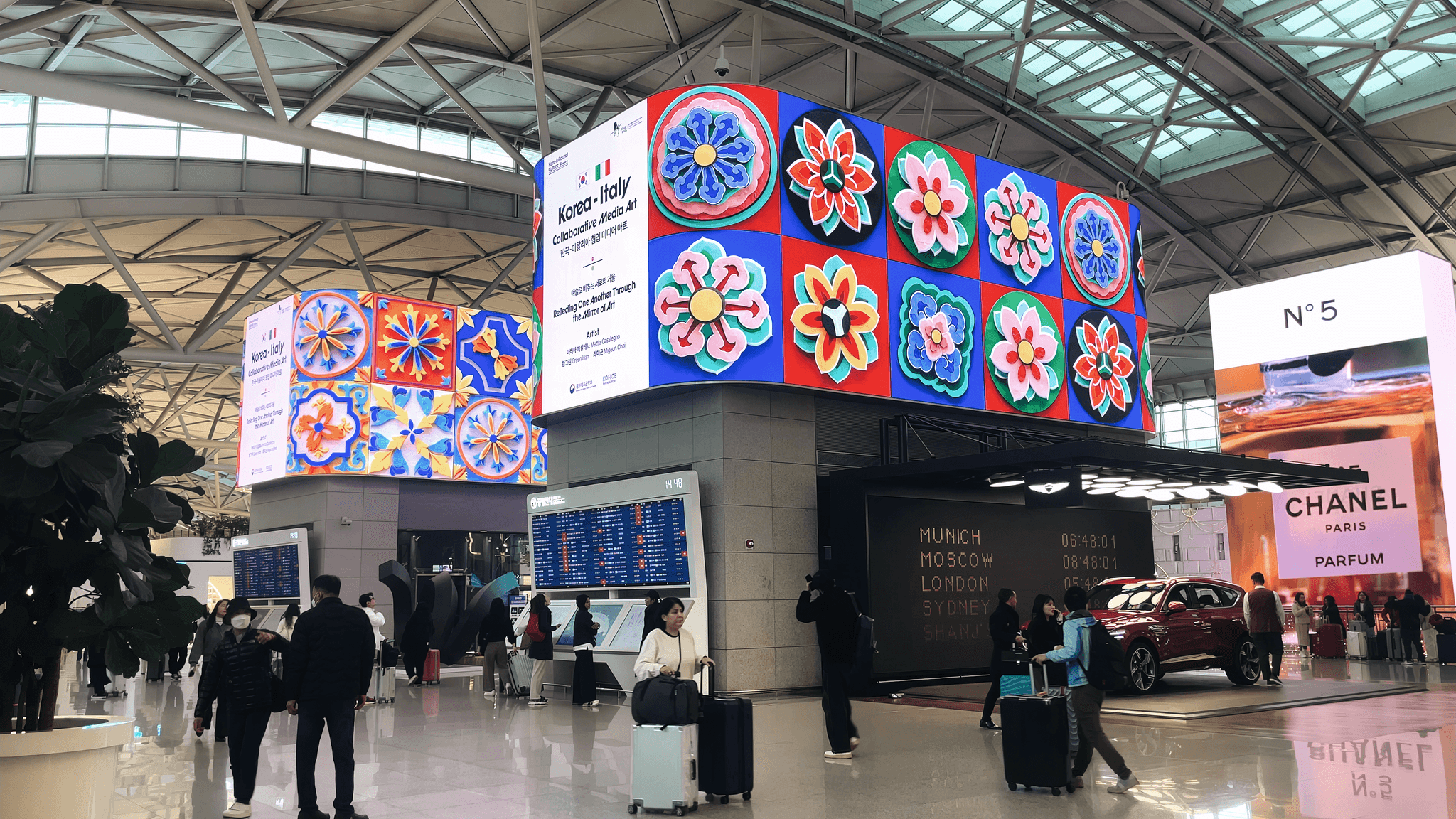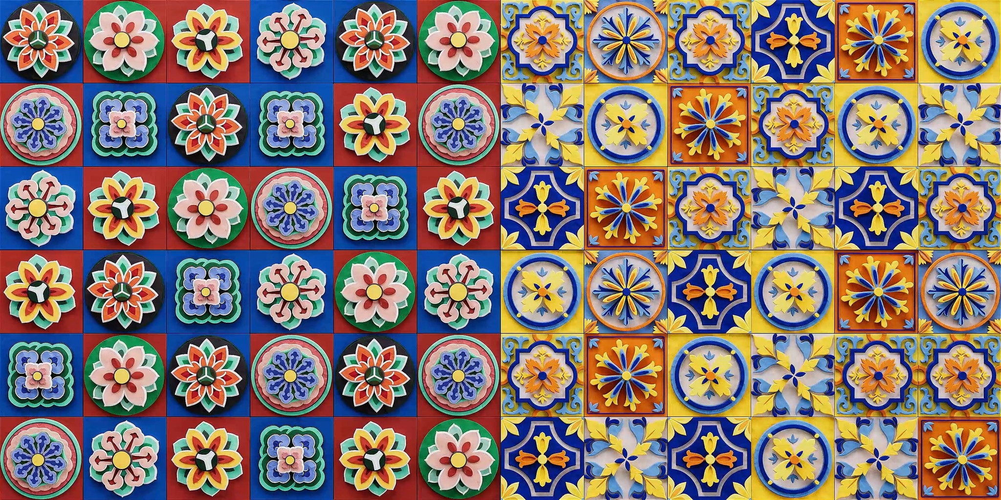 Using Korean dancheong motifs and the bold yellows and blues of Sicilian decorative patterns, the work transforms cultural symbolism into dynamic 3D compositions. Within mirrored structures, patterns from both cultures intersect and flow into a unified visual rhythm, with sequences evoking the motion of clock hands, symbolizing the enduring friendship between the two nations.