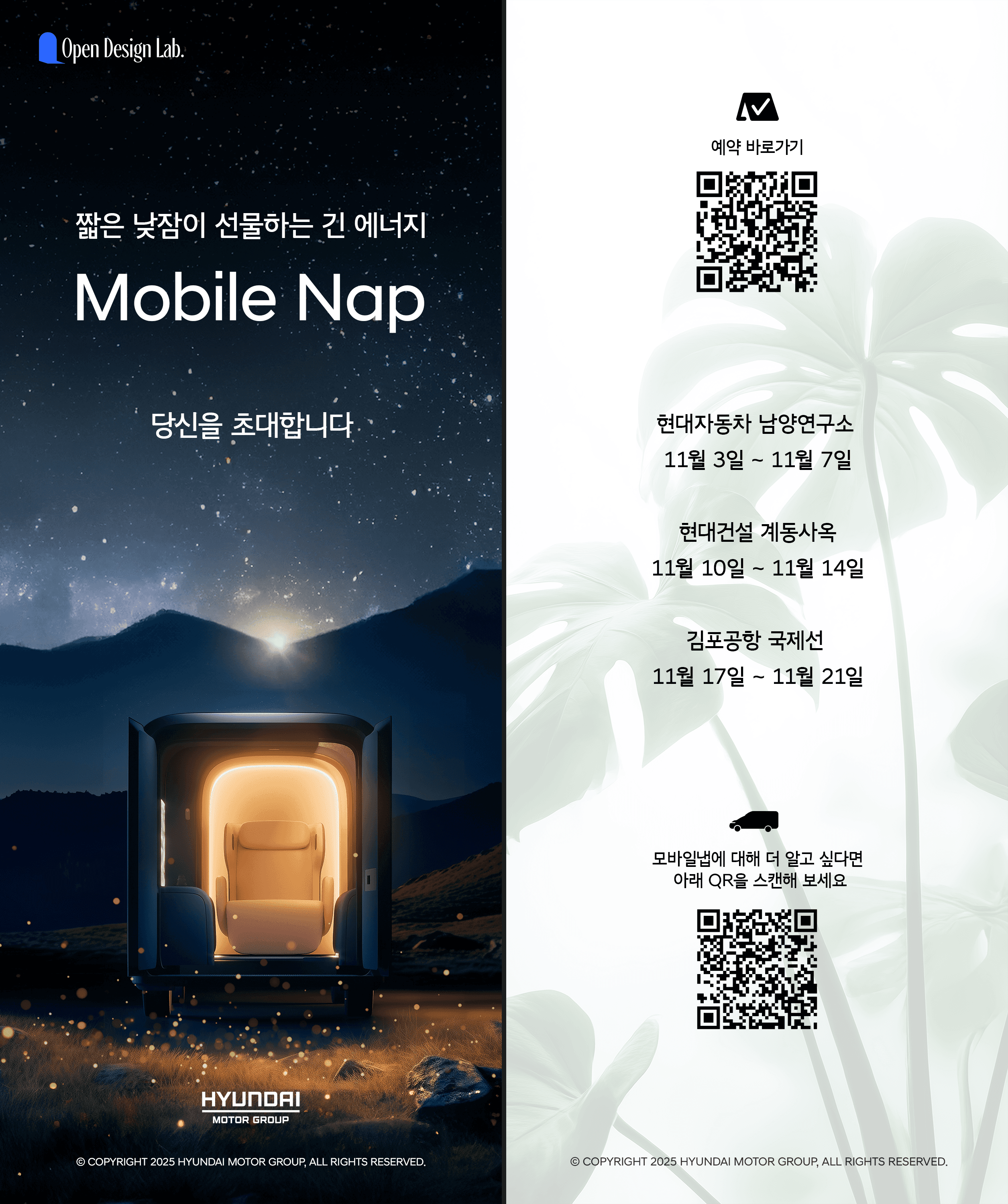 Flovah participated in the PoC operation of Mobile Nap, Hyundai Motor's mobility wellness project exploring in-vehicle sleep environments, contributing to making film production and key visual image creation. The PoC was conducted across three locations: Hyundai Motor's Namyang R&D Center, Hyundai Engineering and Construction headquarters, and Gimpo International Airport.